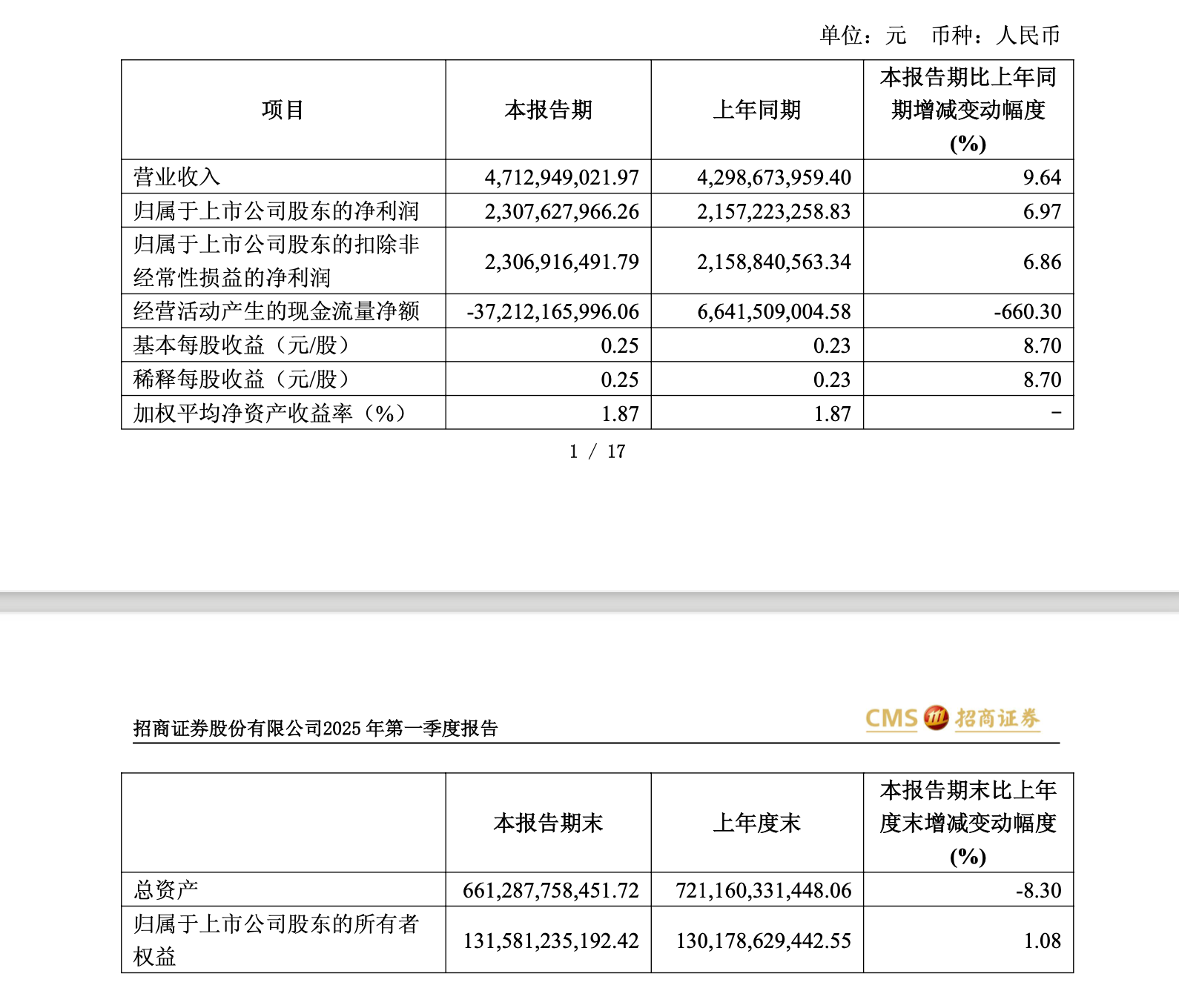 央广网北京4月28日消息(记者樊瑞)28日晚,招商证券(600999.SH)发布2025年第一季度报告。2025年第一季度实现营业收入47.13亿元,同比增长9.64%;归属于上市公司股东的净利润23.08亿元,上年同期归母净利润21.57亿元,同比增长6.97%;基本每股收益0.25元。